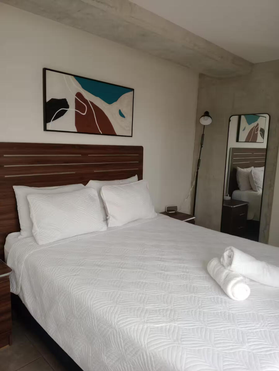 A modern and comfortable executive studio in Zona 10, ideal for remote work or short stays. Featuring a double bed, fully equipped kitchen, work desk, and city views. Located in a building with gym, coworking area, laundry facilities, social terrace, and shared parking. Just minutes from the airport.